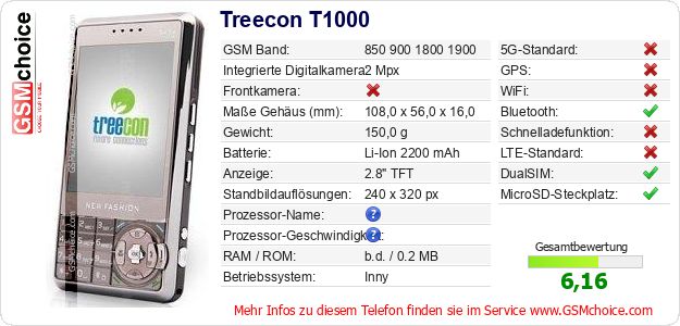 Hast du eigene Webseite? Willst du die Informationen über Standarddaten des Handys Treecon T1000 irgendwo veröffentlichen? Das ist sehr einfach. Du kannst das Bild herunterladen oder kopieren und auf der Webseite folgenden Code hinzufügen:Das Einfügen von diesem Code verursacht das Anzeigen von dem folgenden Bild: