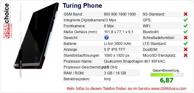 Hast du eigene Webseite? Willst du die Informationen über Standarddaten des Handys Turing Phone irgendwo veröffentlichen? Das ist sehr einfach. Du kannst das Bild herunterladen oder kopieren und auf der Webseite folgenden Code hinzufügen:Das Einfügen von diesem Code verursacht das Anzeigen von dem folgenden Bild: