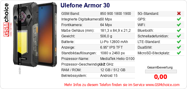 Hast du eigene Webseite? Willst du die Informationen über Standarddaten des Handys Ulefone Armor 30 irgendwo veröffentlichen? Das ist sehr einfach. Du kannst das Bild herunterladen oder kopieren und auf der Webseite folgenden Code hinzufügen:Das Einfügen von diesem Code verursacht das Anzeigen von dem folgenden Bild: