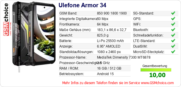 Hast du eigene Webseite? Willst du die Informationen über Standarddaten des Handys Ulefone Armor 34 irgendwo veröffentlichen? Das ist sehr einfach. Du kannst das Bild herunterladen oder kopieren und auf der Webseite folgenden Code hinzufügen:Das Einfügen von diesem Code verursacht das Anzeigen von dem folgenden Bild: