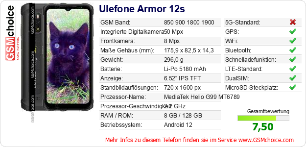 Hast du eigene Webseite? Willst du die Informationen über Standarddaten des Handys Ulefone Armor 12s irgendwo veröffentlichen? Das ist sehr einfach. Du kannst das Bild herunterladen oder kopieren und auf der Webseite folgenden Code hinzufügen:Das Einfügen von diesem Code verursacht das Anzeigen von dem folgenden Bild: