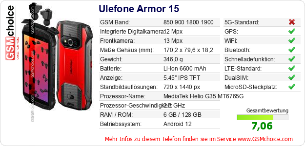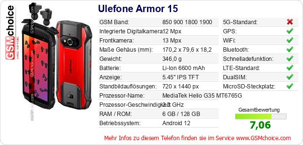 Hast du eigene Webseite? Willst du die Informationen über Standarddaten des Handys Ulefone Armor 15 irgendwo veröffentlichen? Das ist sehr einfach. Du kannst das Bild herunterladen oder kopieren und auf der Webseite folgenden Code hinzufügen:Das Einfügen von diesem Code verursacht das Anzeigen von dem folgenden Bild: