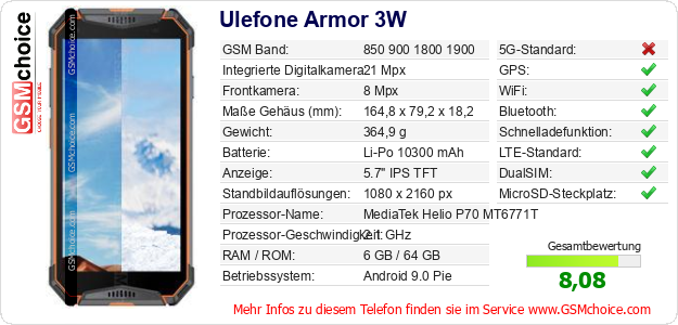 Hast du eigene Webseite? Willst du die Informationen über Standarddaten des Handys Ulefone Armor 3W irgendwo veröffentlichen? Das ist sehr einfach. Du kannst das Bild herunterladen oder kopieren und auf der Webseite folgenden Code hinzufügen:Das Einfügen von diesem Code verursacht das Anzeigen von dem folgenden Bild: