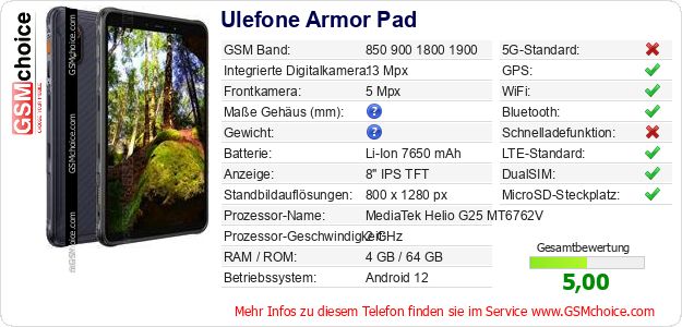 Hast du eigene Webseite? Willst du die Informationen über Standarddaten des Handys Ulefone Armor Pad irgendwo veröffentlichen? Das ist sehr einfach. Du kannst das Bild herunterladen oder kopieren und auf der Webseite folgenden Code hinzufügen:Das Einfügen von diesem Code verursacht das Anzeigen von dem folgenden Bild: