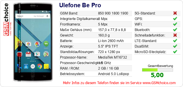 Hast du eigene Webseite? Willst du die Informationen über Standarddaten des Handys Ulefone Be Pro irgendwo veröffentlichen? Das ist sehr einfach. Du kannst das Bild herunterladen oder kopieren und auf der Webseite folgenden Code hinzufügen:Das Einfügen von diesem Code verursacht das Anzeigen von dem folgenden Bild: