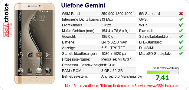 Hast du eigene Webseite? Willst du die Informationen über Standarddaten des Handys Ulefone Gemini irgendwo veröffentlichen? Das ist sehr einfach. Du kannst das Bild herunterladen oder kopieren und auf der Webseite folgenden Code hinzufügen:Das Einfügen von diesem Code verursacht das Anzeigen von dem folgenden Bild: