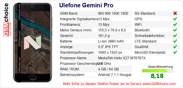 Hast du eigene Webseite? Willst du die Informationen über Standarddaten des Handys Ulefone Gemini Pro irgendwo veröffentlichen? Das ist sehr einfach. Du kannst das Bild herunterladen oder kopieren und auf der Webseite folgenden Code hinzufügen:Das Einfügen von diesem Code verursacht das Anzeigen von dem folgenden Bild: