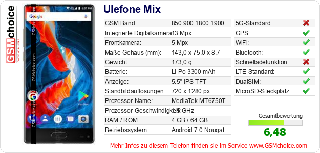 Hast du eigene Webseite? Willst du die Informationen über Standarddaten des Handys Ulefone Mix irgendwo veröffentlichen? Das ist sehr einfach. Du kannst das Bild herunterladen oder kopieren und auf der Webseite folgenden Code hinzufügen:Das Einfügen von diesem Code verursacht das Anzeigen von dem folgenden Bild: