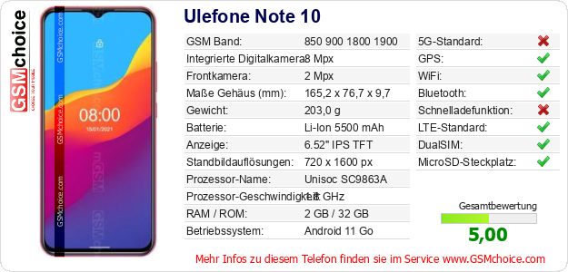 Hast du eigene Webseite? Willst du die Informationen über Standarddaten des Handys Ulefone Note 10 irgendwo veröffentlichen? Das ist sehr einfach. Du kannst das Bild herunterladen oder kopieren und auf der Webseite folgenden Code hinzufügen:Das Einfügen von diesem Code verursacht das Anzeigen von dem folgenden Bild:
