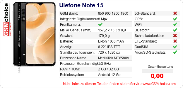 Hast du eigene Webseite? Willst du die Informationen über Standarddaten des Handys Ulefone Note 15 irgendwo veröffentlichen? Das ist sehr einfach. Du kannst das Bild herunterladen oder kopieren und auf der Webseite folgenden Code hinzufügen:Das Einfügen von diesem Code verursacht das Anzeigen von dem folgenden Bild:
