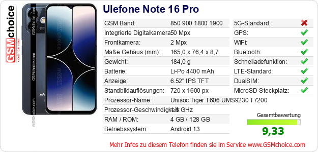 Hast du eigene Webseite? Willst du die Informationen über Standarddaten des Handys Ulefone Note 16 Pro irgendwo veröffentlichen? Das ist sehr einfach. Du kannst das Bild herunterladen oder kopieren und auf der Webseite folgenden Code hinzufügen:Das Einfügen von diesem Code verursacht das Anzeigen von dem folgenden Bild:
