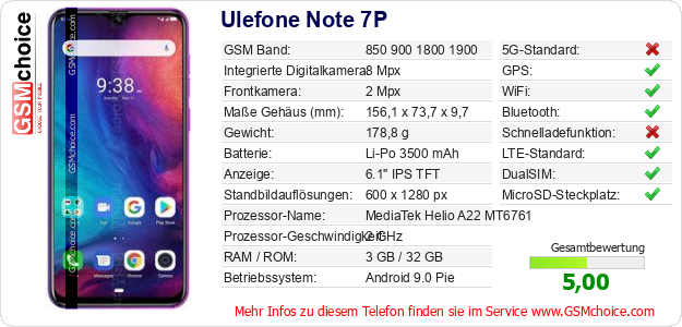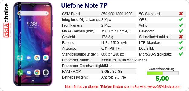 Hast du eigene Webseite? Willst du die Informationen über Standarddaten des Handys Ulefone Note 7P irgendwo veröffentlichen? Das ist sehr einfach. Du kannst das Bild herunterladen oder kopieren und auf der Webseite folgenden Code hinzufügen:Das Einfügen von diesem Code verursacht das Anzeigen von dem folgenden Bild: