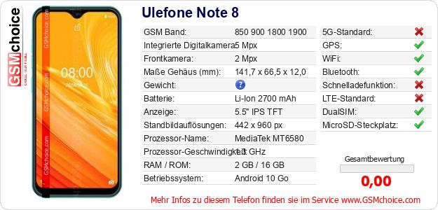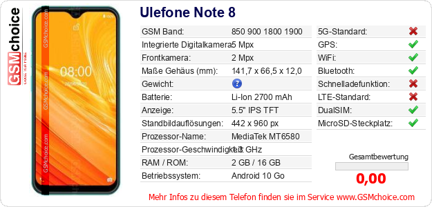 Hast du eigene Webseite? Willst du die Informationen über Standarddaten des Handys Ulefone Note 8 irgendwo veröffentlichen? Das ist sehr einfach. Du kannst das Bild herunterladen oder kopieren und auf der Webseite folgenden Code hinzufügen:Das Einfügen von diesem Code verursacht das Anzeigen von dem folgenden Bild: