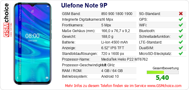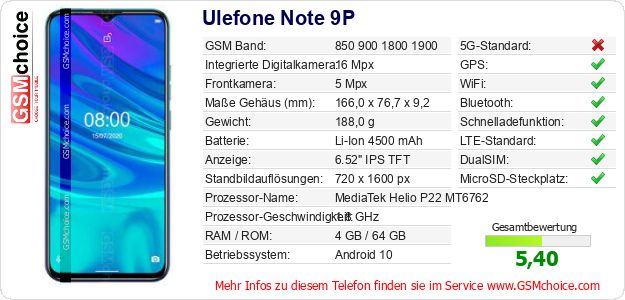 Hast du eigene Webseite? Willst du die Informationen über Standarddaten des Handys Ulefone Note 9P irgendwo veröffentlichen? Das ist sehr einfach. Du kannst das Bild herunterladen oder kopieren und auf der Webseite folgenden Code hinzufügen:Das Einfügen von diesem Code verursacht das Anzeigen von dem folgenden Bild: