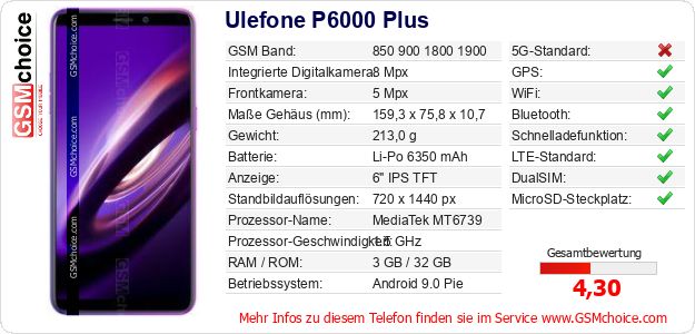 Daten des Mobiltelefons Ulefone P6000 Plus auf Ihrer Seite