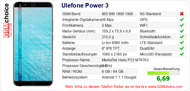 Hast du eigene Webseite? Willst du die Informationen über Standarddaten des Handys Ulefone Power 3 irgendwo veröffentlichen? Das ist sehr einfach. Du kannst das Bild herunterladen oder kopieren und auf der Webseite folgenden Code hinzufügen:Das Einfügen von diesem Code verursacht das Anzeigen von dem folgenden Bild: