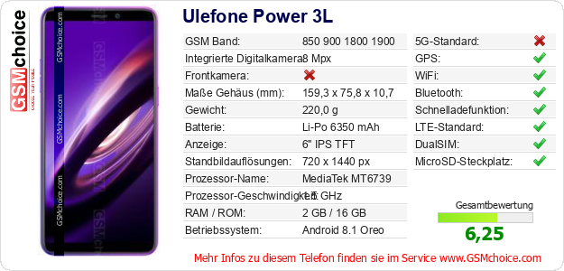 Daten des Mobiltelefons Ulefone Power 3L auf Ihrer Seite