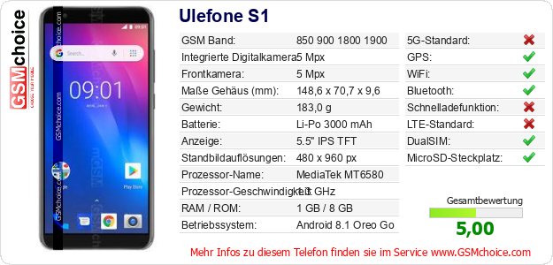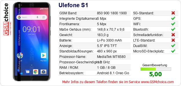Hast du eigene Webseite? Willst du die Informationen über Standarddaten des Handys Ulefone S1 irgendwo veröffentlichen? Das ist sehr einfach. Du kannst das Bild herunterladen oder kopieren und auf der Webseite folgenden Code hinzufügen:Das Einfügen von diesem Code verursacht das Anzeigen von dem folgenden Bild: