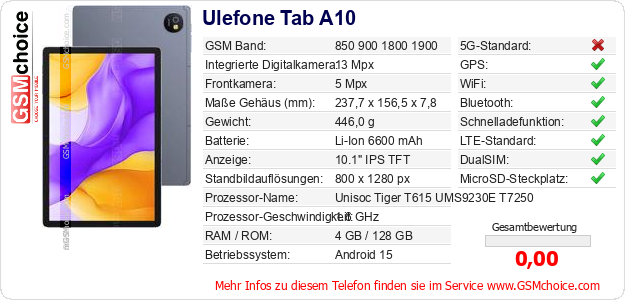 Hast du eigene Webseite? Willst du die Informationen über Standarddaten des Handys Ulefone Tab A10 irgendwo veröffentlichen? Das ist sehr einfach. Du kannst das Bild herunterladen oder kopieren und auf der Webseite folgenden Code hinzufügen:Das Einfügen von diesem Code verursacht das Anzeigen von dem folgenden Bild: