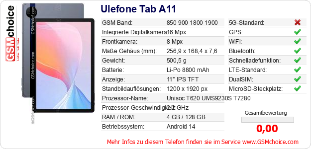 Hast du eigene Webseite? Willst du die Informationen über Standarddaten des Handys Ulefone Tab A11 irgendwo veröffentlichen? Das ist sehr einfach. Du kannst das Bild herunterladen oder kopieren und auf der Webseite folgenden Code hinzufügen:Das Einfügen von diesem Code verursacht das Anzeigen von dem folgenden Bild:
