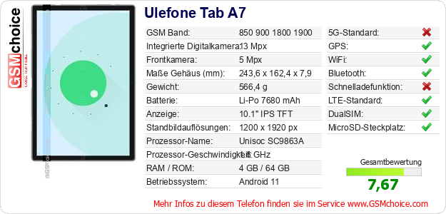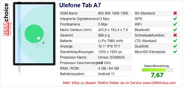 Hast du eigene Webseite? Willst du die Informationen über Standarddaten des Handys Ulefone Tab A7 irgendwo veröffentlichen? Das ist sehr einfach. Du kannst das Bild herunterladen oder kopieren und auf der Webseite folgenden Code hinzufügen:Das Einfügen von diesem Code verursacht das Anzeigen von dem folgenden Bild: