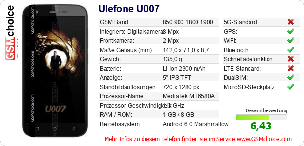 Hast du eigene Webseite? Willst du die Informationen über Standarddaten des Handys Ulefone U007 irgendwo veröffentlichen? Das ist sehr einfach. Du kannst das Bild herunterladen oder kopieren und auf der Webseite folgenden Code hinzufügen:Das Einfügen von diesem Code verursacht das Anzeigen von dem folgenden Bild: