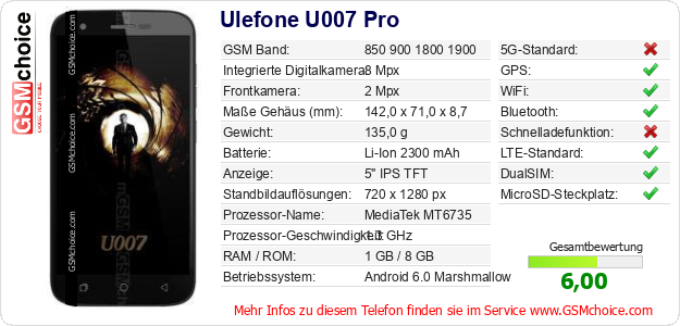 Hast du eigene Webseite? Willst du die Informationen über Standarddaten des Handys Ulefone U007 Pro irgendwo veröffentlichen? Das ist sehr einfach. Du kannst das Bild herunterladen oder kopieren und auf der Webseite folgenden Code hinzufügen:Das Einfügen von diesem Code verursacht das Anzeigen von dem folgenden Bild: