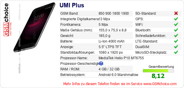 Hast du eigene Webseite? Willst du die Informationen über Standarddaten des Handys UMI Plus irgendwo veröffentlichen? Das ist sehr einfach. Du kannst das Bild herunterladen oder kopieren und auf der Webseite folgenden Code hinzufügen:Das Einfügen von diesem Code verursacht das Anzeigen von dem folgenden Bild: