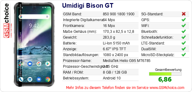 Hast du eigene Webseite? Willst du die Informationen über Standarddaten des Handys Umidigi Bison GT irgendwo veröffentlichen? Das ist sehr einfach. Du kannst das Bild herunterladen oder kopieren und auf der Webseite folgenden Code hinzufügen:Das Einfügen von diesem Code verursacht das Anzeigen von dem folgenden Bild: