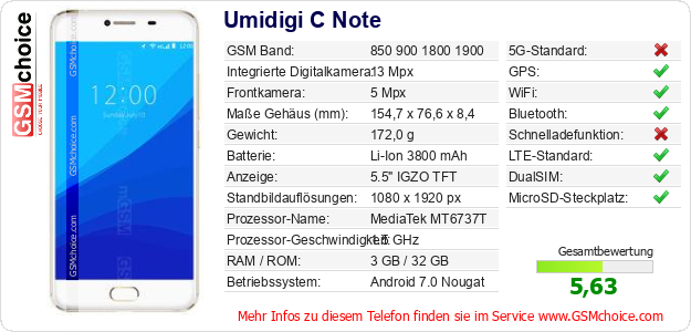 Hast du eigene Webseite? Willst du die Informationen über Standarddaten des Handys Umidigi C Note irgendwo veröffentlichen? Das ist sehr einfach. Du kannst das Bild herunterladen oder kopieren und auf der Webseite folgenden Code hinzufügen:Das Einfügen von diesem Code verursacht das Anzeigen von dem folgenden Bild: