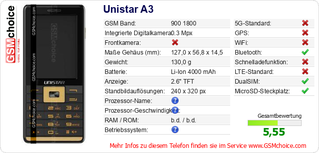 Hast du eigene Webseite? Willst du die Informationen über Standarddaten des Handys Unistar A3 irgendwo veröffentlichen? Das ist sehr einfach. Du kannst das Bild herunterladen oder kopieren und auf der Webseite folgenden Code hinzufügen:Das Einfügen von diesem Code verursacht das Anzeigen von dem folgenden Bild: