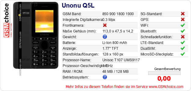 Daten des Mobiltelefons Unonu Q5L auf Ihrer Seite