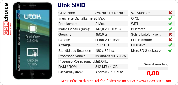 Hast du eigene Webseite? Willst du die Informationen über Standarddaten des Handys Utok 500D irgendwo veröffentlichen? Das ist sehr einfach. Du kannst das Bild herunterladen oder kopieren und auf der Webseite folgenden Code hinzufügen:Das Einfügen von diesem Code verursacht das Anzeigen von dem folgenden Bild: