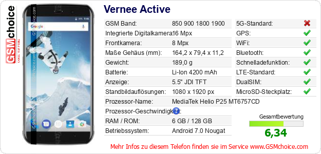 Hast du eigene Webseite? Willst du die Informationen über Standarddaten des Handys Vernee Active irgendwo veröffentlichen? Das ist sehr einfach. Du kannst das Bild herunterladen oder kopieren und auf der Webseite folgenden Code hinzufügen:Das Einfügen von diesem Code verursacht das Anzeigen von dem folgenden Bild: