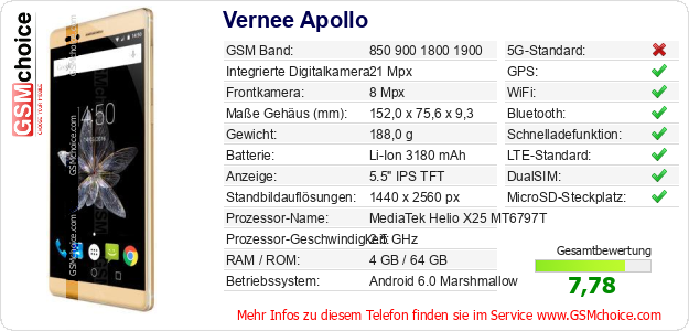 Hast du eigene Webseite? Willst du die Informationen über Standarddaten des Handys Vernee Apollo irgendwo veröffentlichen? Das ist sehr einfach. Du kannst das Bild herunterladen oder kopieren und auf der Webseite folgenden Code hinzufügen:Das Einfügen von diesem Code verursacht das Anzeigen von dem folgenden Bild: