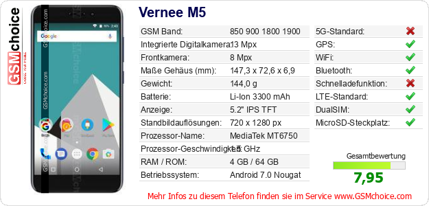 Hast du eigene Webseite? Willst du die Informationen über Standarddaten des Handys Vernee M5 irgendwo veröffentlichen? Das ist sehr einfach. Du kannst das Bild herunterladen oder kopieren und auf der Webseite folgenden Code hinzufügen:Das Einfügen von diesem Code verursacht das Anzeigen von dem folgenden Bild: