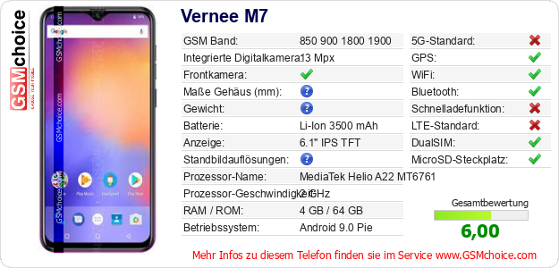 Hast du eigene Webseite? Willst du die Informationen über Standarddaten des Handys Vernee M7 irgendwo veröffentlichen? Das ist sehr einfach. Du kannst das Bild herunterladen oder kopieren und auf der Webseite folgenden Code hinzufügen:Das Einfügen von diesem Code verursacht das Anzeigen von dem folgenden Bild: