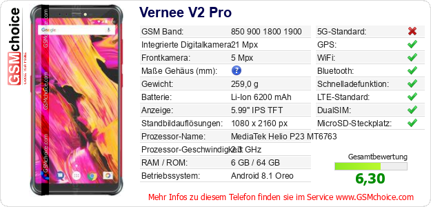 Hast du eigene Webseite? Willst du die Informationen über Standarddaten des Handys Vernee V2 Pro irgendwo veröffentlichen? Das ist sehr einfach. Du kannst das Bild herunterladen oder kopieren und auf der Webseite folgenden Code hinzufügen:Das Einfügen von diesem Code verursacht das Anzeigen von dem folgenden Bild:
