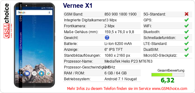 Hast du eigene Webseite? Willst du die Informationen über Standarddaten des Handys Vernee X1 irgendwo veröffentlichen? Das ist sehr einfach. Du kannst das Bild herunterladen oder kopieren und auf der Webseite folgenden Code hinzufügen:Das Einfügen von diesem Code verursacht das Anzeigen von dem folgenden Bild: