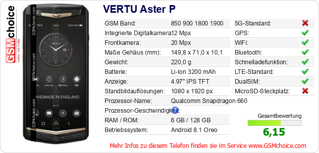 Hast du eigene Webseite? Willst du die Informationen über Standarddaten des Handys VERTU Aster P irgendwo veröffentlichen? Das ist sehr einfach. Du kannst das Bild herunterladen oder kopieren und auf der Webseite folgenden Code hinzufügen:Das Einfügen von diesem Code verursacht das Anzeigen von dem folgenden Bild: