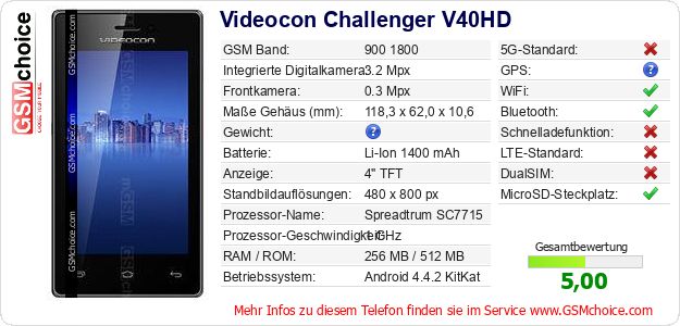 Hast du eigene Webseite? Willst du die Informationen über Standarddaten des Handys Videocon Challenger V40HD irgendwo veröffentlichen? Das ist sehr einfach. Du kannst das Bild herunterladen oder kopieren und auf der Webseite folgenden Code hinzufügen:Das Einfügen von diesem Code verursacht das Anzeigen von dem folgenden Bild: