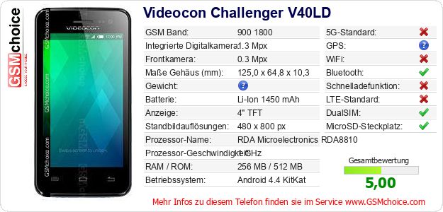 Hast du eigene Webseite? Willst du die Informationen über Standarddaten des Handys Videocon Challenger V40LD irgendwo veröffentlichen? Das ist sehr einfach. Du kannst das Bild herunterladen oder kopieren und auf der Webseite folgenden Code hinzufügen:Das Einfügen von diesem Code verursacht das Anzeigen von dem folgenden Bild: