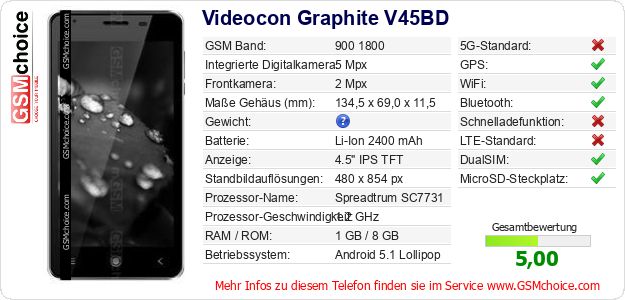 Daten des Mobiltelefons Videocon Graphite V45BD auf Ihrer Seite