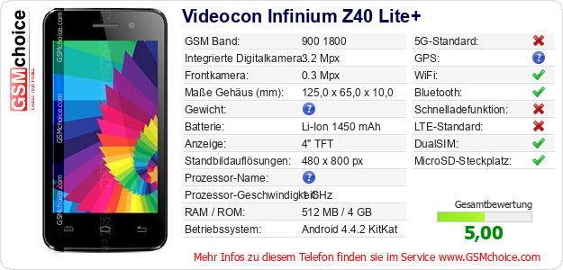 Hast du eigene Webseite? Willst du die Informationen über Standarddaten des Handys Videocon Infinium Z40 Lite+ irgendwo veröffentlichen? Das ist sehr einfach. Du kannst das Bild herunterladen oder kopieren und auf der Webseite folgenden Code hinzufügen:Das Einfügen von diesem Code verursacht das Anzeigen von dem folgenden Bild: