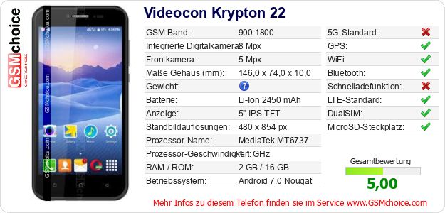 Hast du eigene Webseite? Willst du die Informationen über Standarddaten des Handys Videocon Krypton 22 irgendwo veröffentlichen? Das ist sehr einfach. Du kannst das Bild herunterladen oder kopieren und auf der Webseite folgenden Code hinzufügen:Das Einfügen von diesem Code verursacht das Anzeigen von dem folgenden Bild: