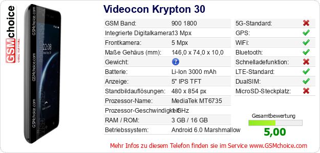 Hast du eigene Webseite? Willst du die Informationen über Standarddaten des Handys Videocon Krypton 30 irgendwo veröffentlichen? Das ist sehr einfach. Du kannst das Bild herunterladen oder kopieren und auf der Webseite folgenden Code hinzufügen:Das Einfügen von diesem Code verursacht das Anzeigen von dem folgenden Bild: