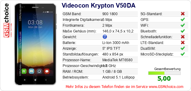 Daten des Mobiltelefons Videocon Krypton V50DA auf Ihrer Seite