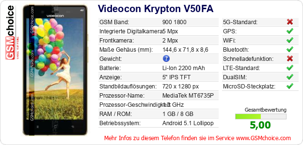 Hast du eigene Webseite? Willst du die Informationen über Standarddaten des Handys Videocon Krypton V50FA irgendwo veröffentlichen? Das ist sehr einfach. Du kannst das Bild herunterladen oder kopieren und auf der Webseite folgenden Code hinzufügen:Das Einfügen von diesem Code verursacht das Anzeigen von dem folgenden Bild: