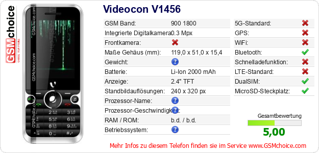 Hast du eigene Webseite? Willst du die Informationen über Standarddaten des Handys Videocon V1456 irgendwo veröffentlichen? Das ist sehr einfach. Du kannst das Bild herunterladen oder kopieren und auf der Webseite folgenden Code hinzufügen:Das Einfügen von diesem Code verursacht das Anzeigen von dem folgenden Bild: