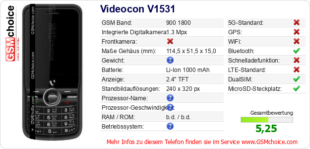 Hast du eigene Webseite? Willst du die Informationen über Standarddaten des Handys Videocon V1531 irgendwo veröffentlichen? Das ist sehr einfach. Du kannst das Bild herunterladen oder kopieren und auf der Webseite folgenden Code hinzufügen:Das Einfügen von diesem Code verursacht das Anzeigen von dem folgenden Bild: